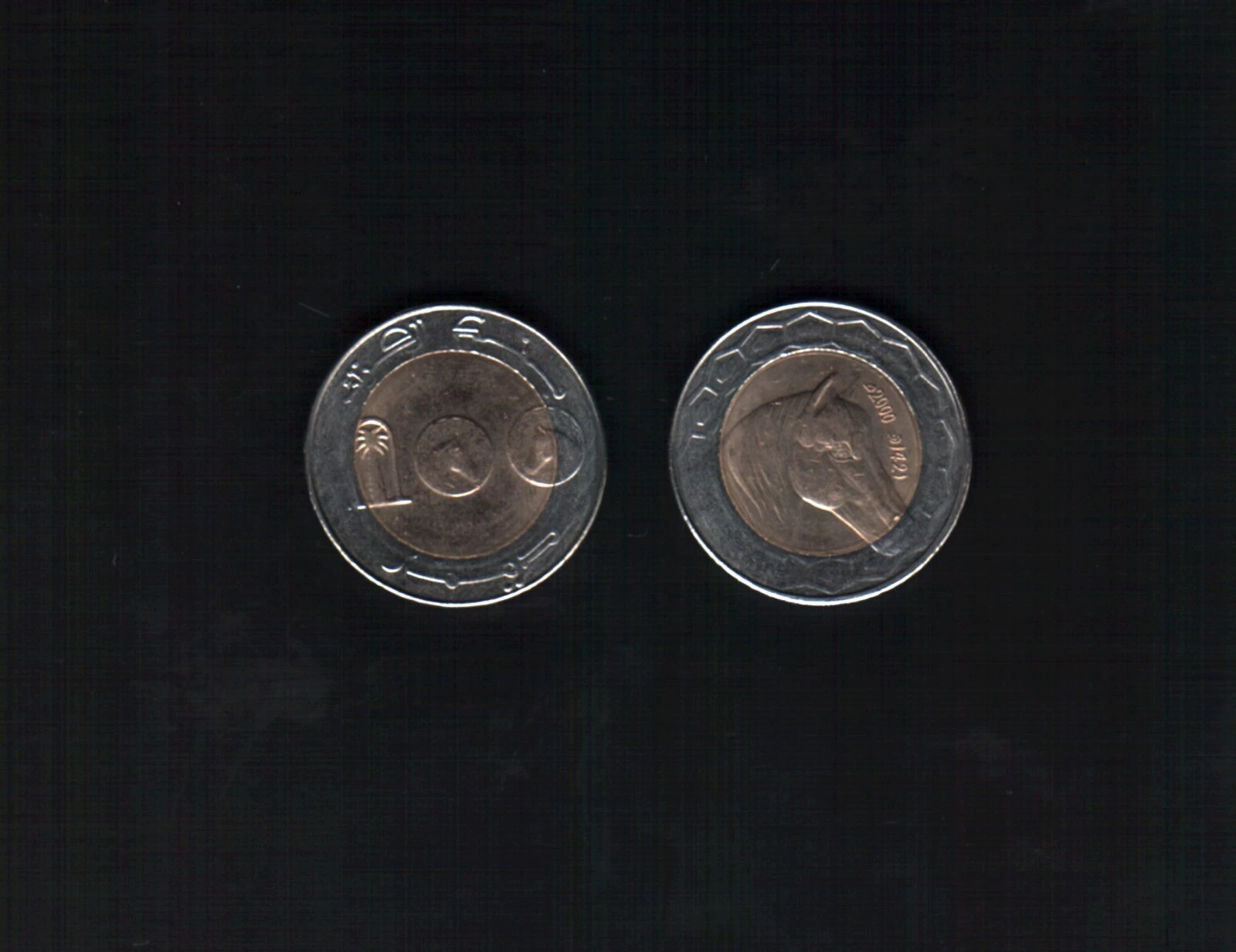 ALGERIA 100 Dinars KM 2000 Millennium issue UNC Bi-Metal scarce coin,bearing the picture of Horse head,year and denomination stylized with reverse design on back.Excellent coin for Bi-Metal collectors. NOT TO BE MISSED.